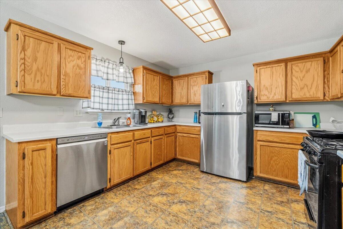 This beautifully refreshed 4-bedroom, 2-bath home shines inside and out. The bright, well-appointed kitchen offers abundant cabinetry and comes complete with a dishwasher and refrigerator. Durable laminate and vinyl flooring flow throughout for easy living. Nice 2 car garage with finished walls! Step outside to a private deck overlooking a fully fenced, thoughtfully landscaped yard--your own quiet retreat. This home is Move -in-Ready!!!