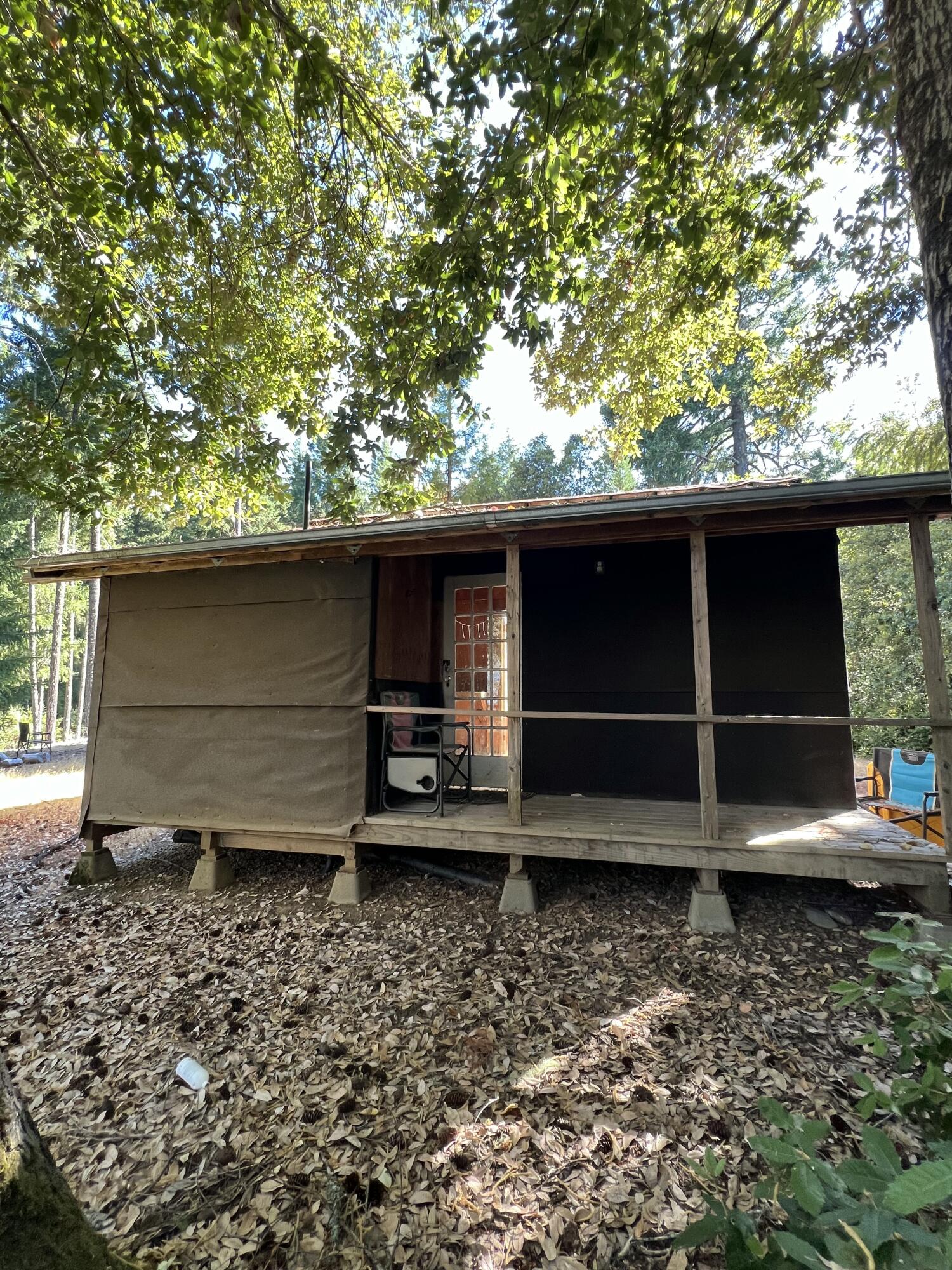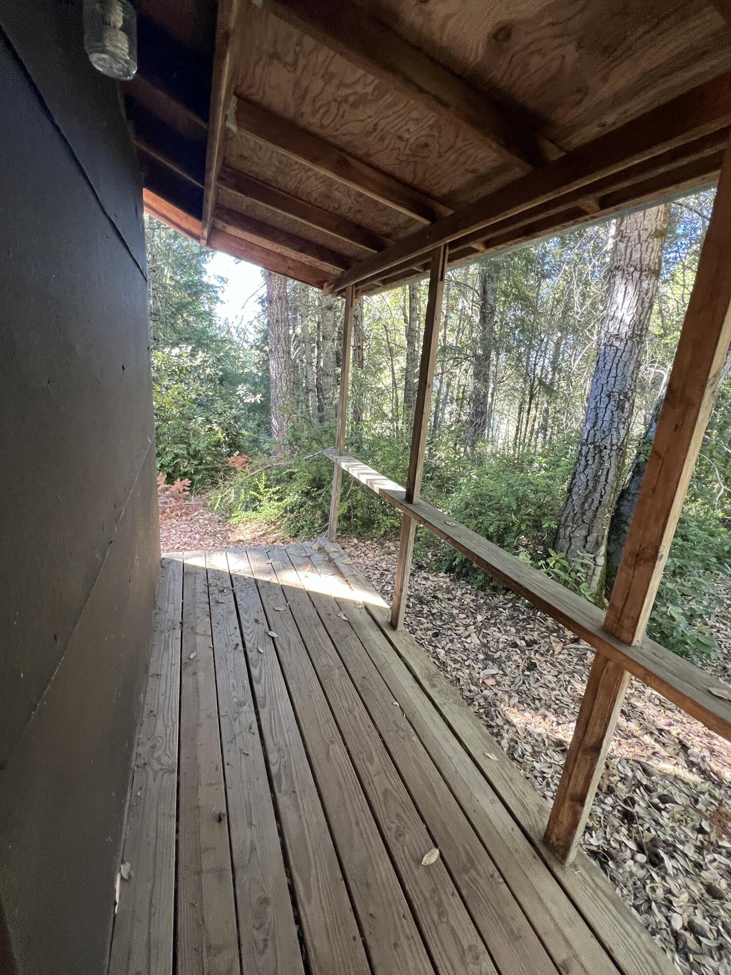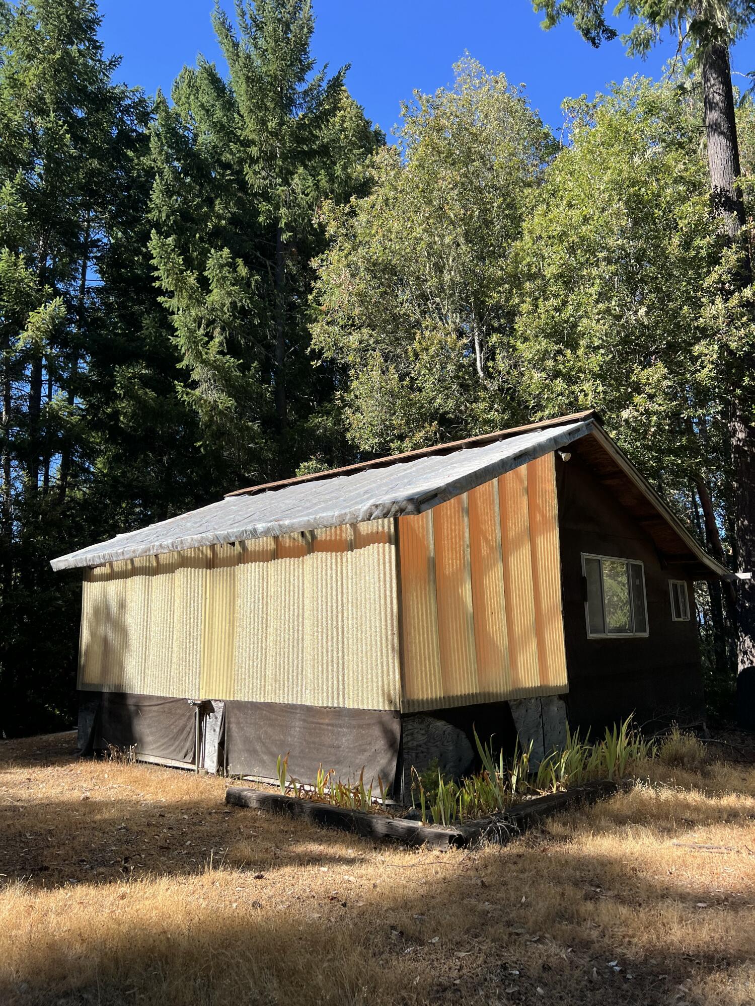 Lovely studio/cabin nestled in Alderpoint. This piece of property offers endless opportunities. It has a Living room/bedroom, sunroom with kitchen appliances and covered porch. +/-10 acres with lots of usable land. Has mature trees. PG&E power and flat usable areas. This property offers plenty of water from two workings wells, and has six 5,000 gal water tanks for storage. Storage container for extra space. Note: Property has a nuisance on file