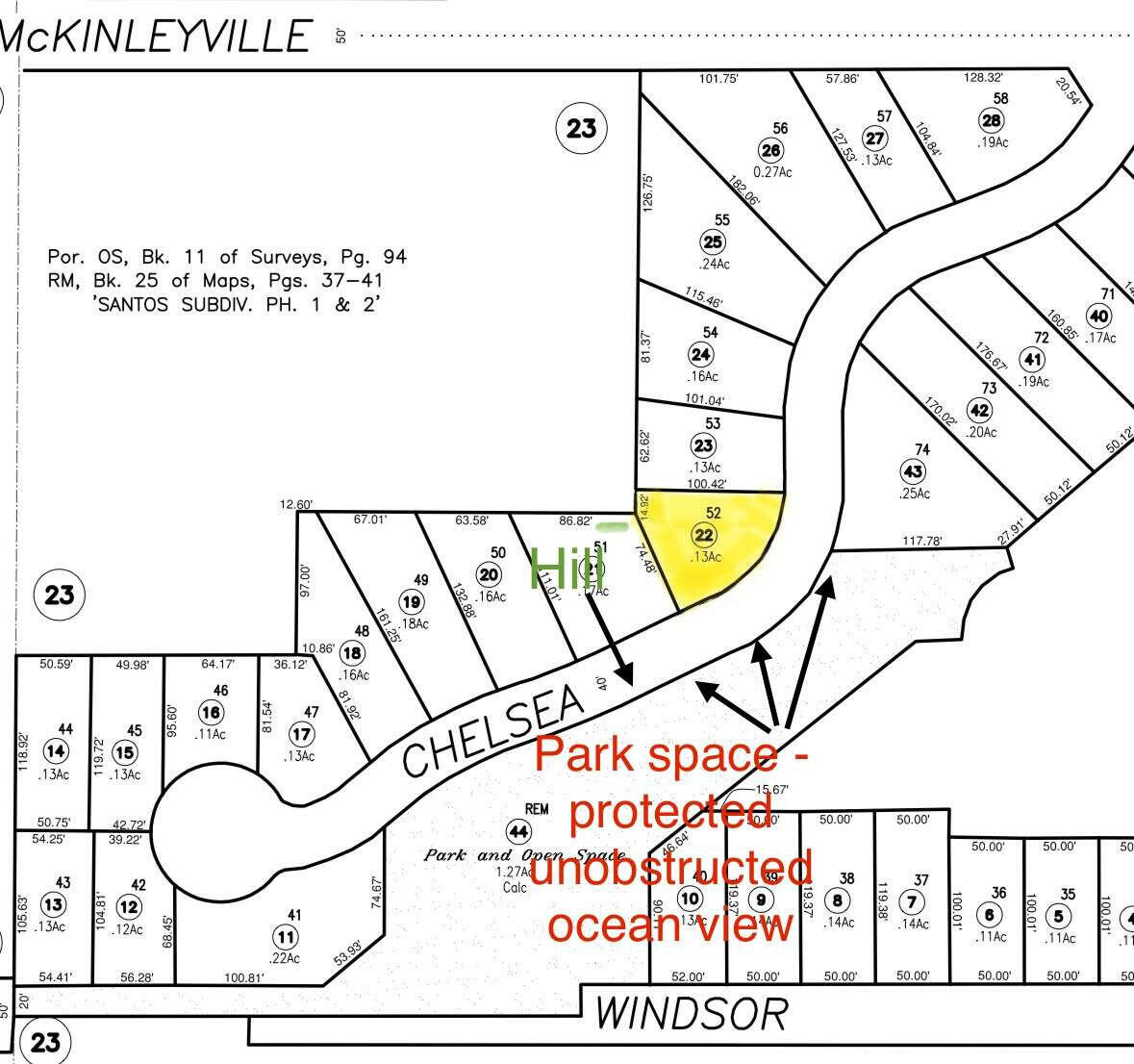 This is a Minimum Service Listing, please call your agent for details. Desirable lot in newer McKinleyville neighborhood situated amongst lovely custom built homes. This lot is zoned to build a two story house to take advantage of the spectacular ocean view. The lot is situated directly across Chelsea way from open park space, so the view will be enjoyed for years to come!