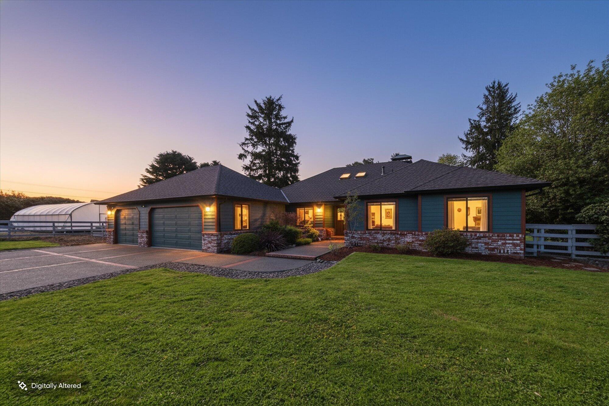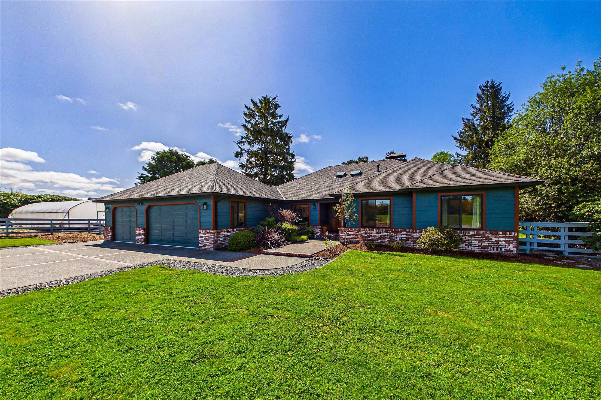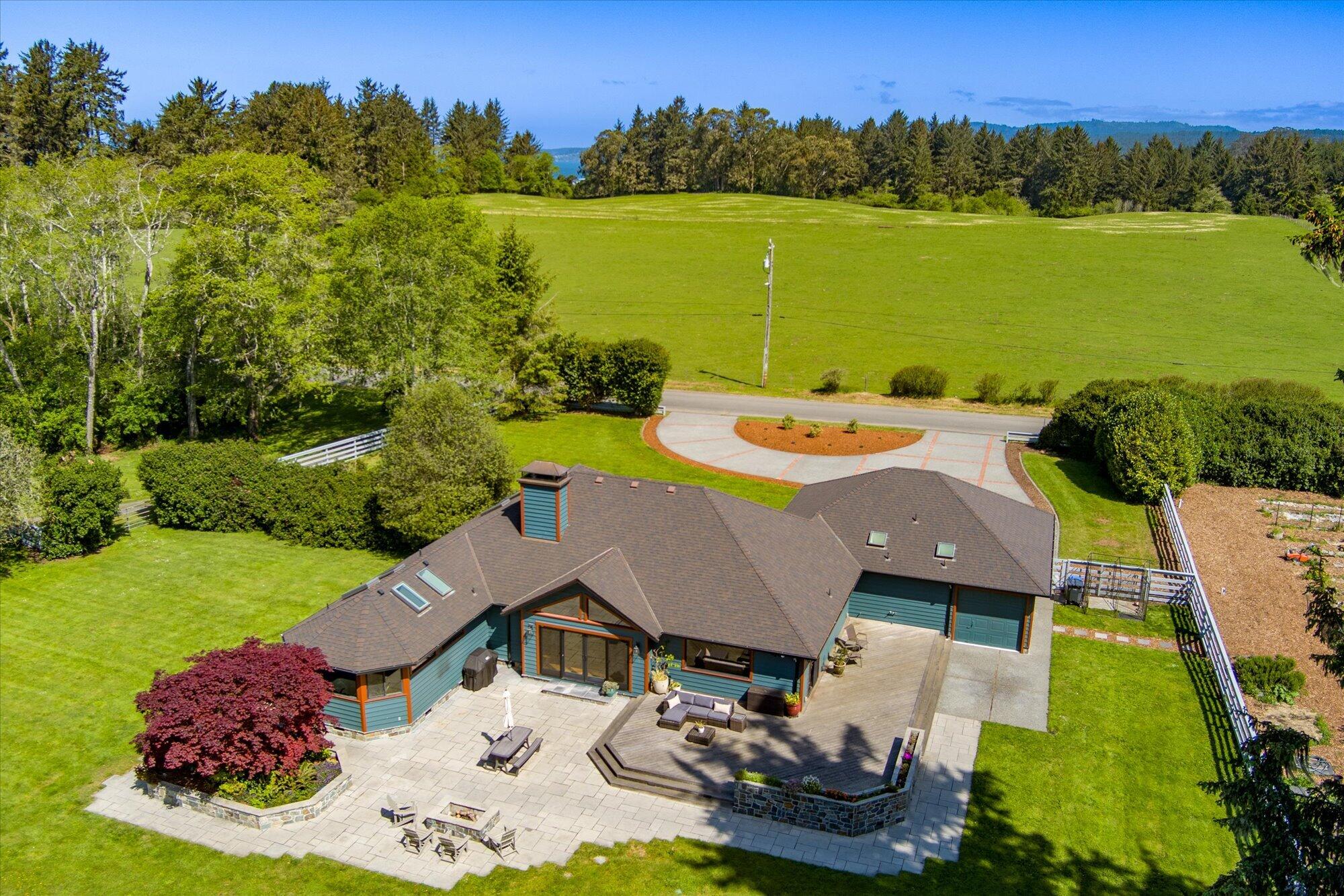 Elevated country living w/designer finishes and fully realized garden estate. This stunning single-level 3 bed, 2.5 bath +/- 2526 sq ft home sits on 5 flat, usable acres with a finished triple garage. Light-filled interiors feature engineered eucalyptus hardwood floors and reclaimed old-growth redwood trim throughout. The living room showcases a vaulted open-beam ceiling and a cozy woodstove. The chef's kitchen offers hickory cabinetry, Virginia Mist granite, Thermador appliances, 6 burner Viking cooktop, copper farmhouse sink, and striking redwood burl breakfast bar. The primary suite includes dual cedar-lined closets, a gas fireplace with stone surround, bonus flex space, and a spa-inspired bath with curbless porcelain tile shower, separate steam shower, hydrotherapy tub, and skylight Outside, enjoy Ipe hardwood decks, firepit, patio, greenhouse, irrigated gardens, barn, and cross-fenced pasture. Too many upgrades and features to list. Ocean views from the property's edge and just moments to direct beach access complete this exceptional coastal retreat.