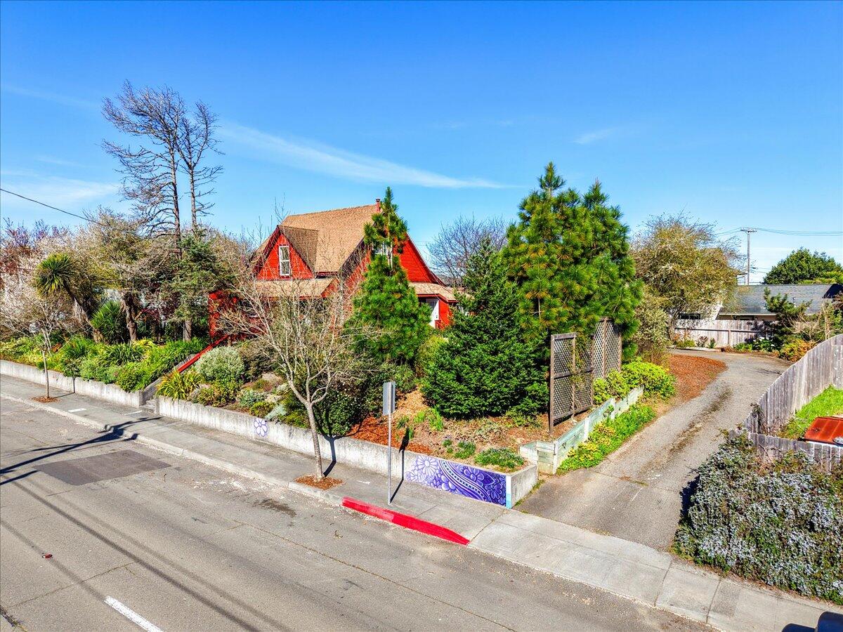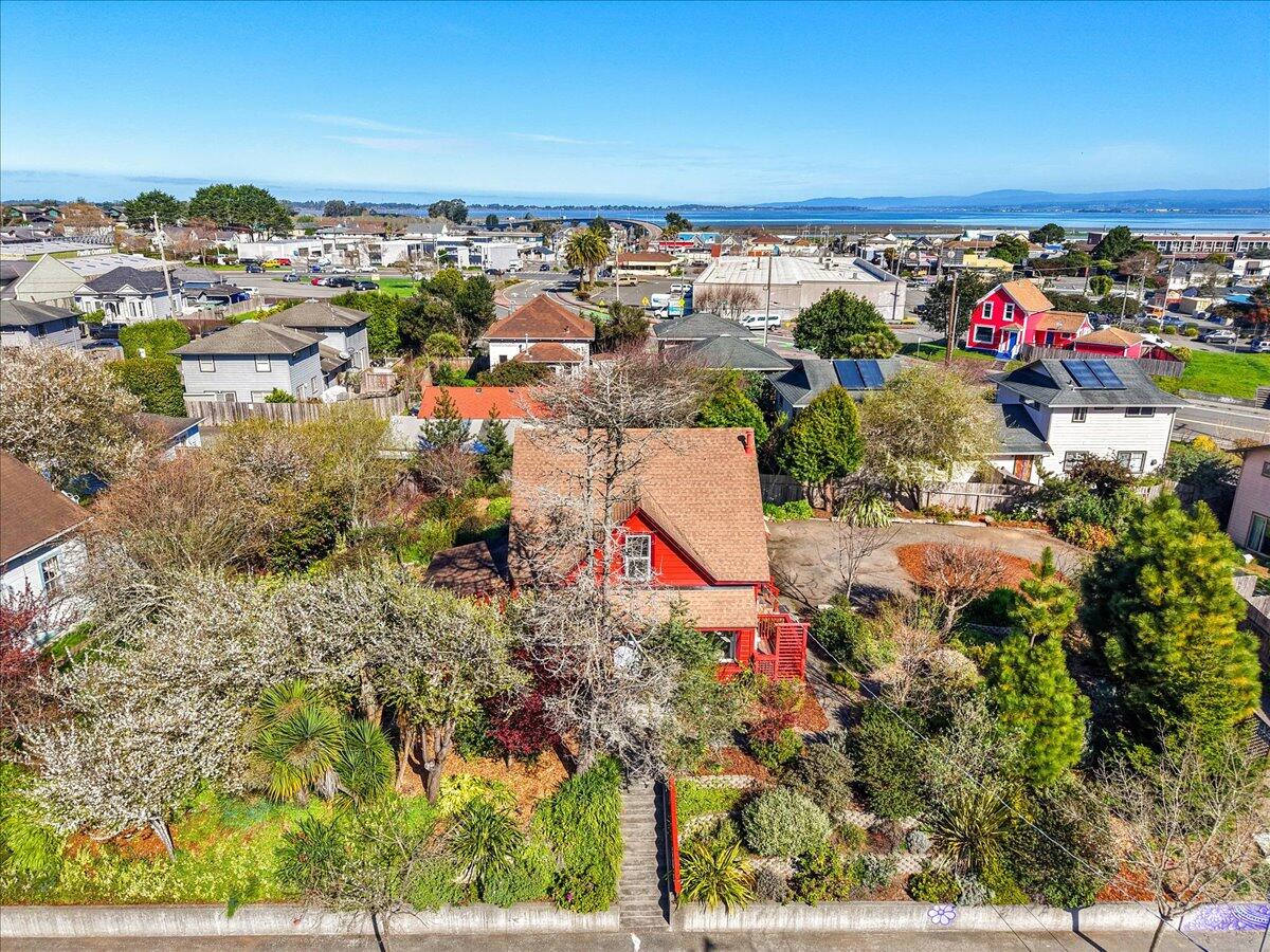An incredibly rare opportunity to own an 1886 Farmhouse chalked full of charm and character! This immaculate 1396sf home is in pristine condition and features a litany of prudent improvements. The house sits upon an elevated and private, 0.26 acre lot that is laden with beautifully mature landscaping, all just 10 blocks from Humboldt Bay! A true walk up, with terraced landscaping above the street level retaining walls, and a private wrap-around driveway up to the home's garage. Inside, the kitchen's subtle elegance is perfectly juxtaposed by the gold framed backsplash above the down-drafted stove, while a set of French doors off of the living room leads to a private deck. The roomy first floor bedroom is the largest in the house and has its own French doors to the magnificent backyard. Up the well appointed staircase you will find the primary bedroom with a quaint reading nook and views of the bay. The stunning en-suite bathroom has a gold claw foot tub with paired wallpaper on one end, and a vibrant vessel sink and wall hung toilet on the other. The third bedroom is located on the other side of the stairs and features the same painted wood ceilings from the rest of the house, wood panel wall accents, and its own unique colorful wall paper. The home's oversized interior laundry room adds to your comfort and storage space, which is backed by the wall of cabinets in the two car garage. The backyard features an attached deck with exquisite trellis, raised beds, detached sun deck, and robust and lush landscaping everywhere you look. Local artist Blake Reagan painted a brilliant mural on the retaining wall just to the side of the driveway entrance capping off a beautiful and unique property!