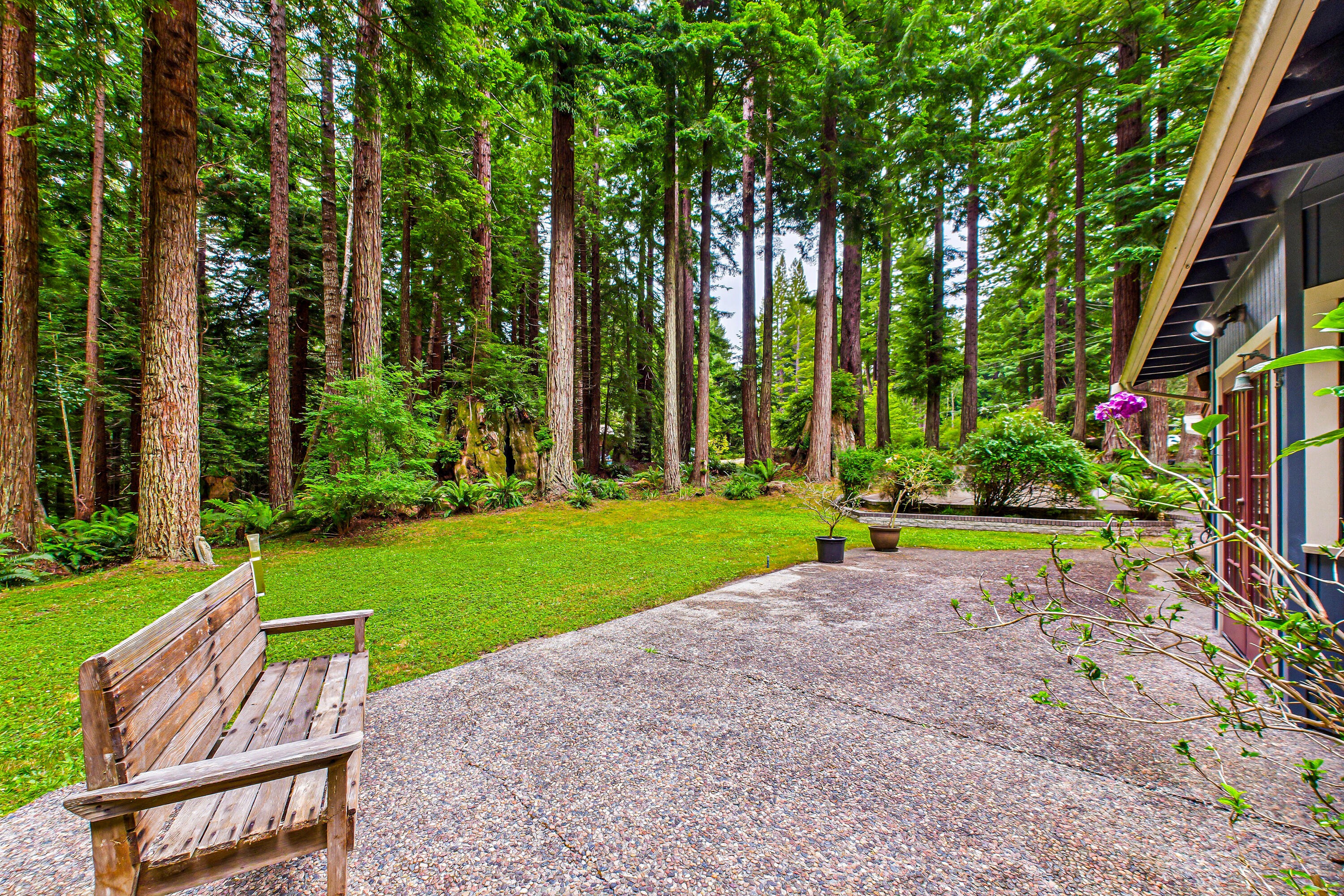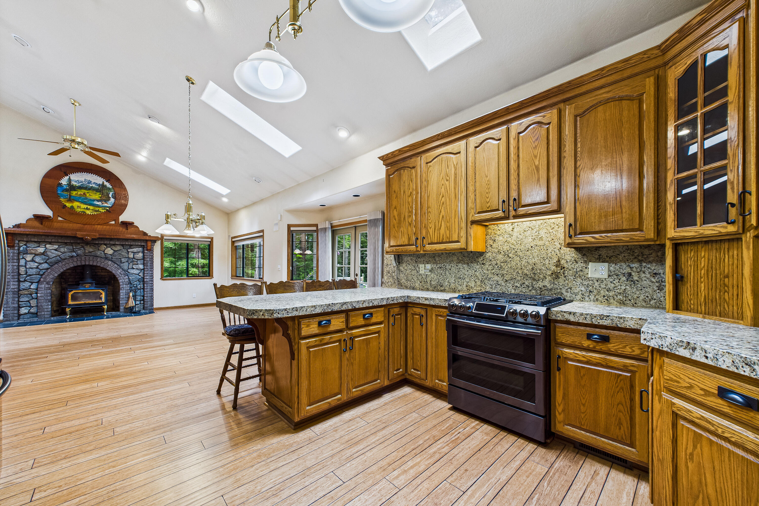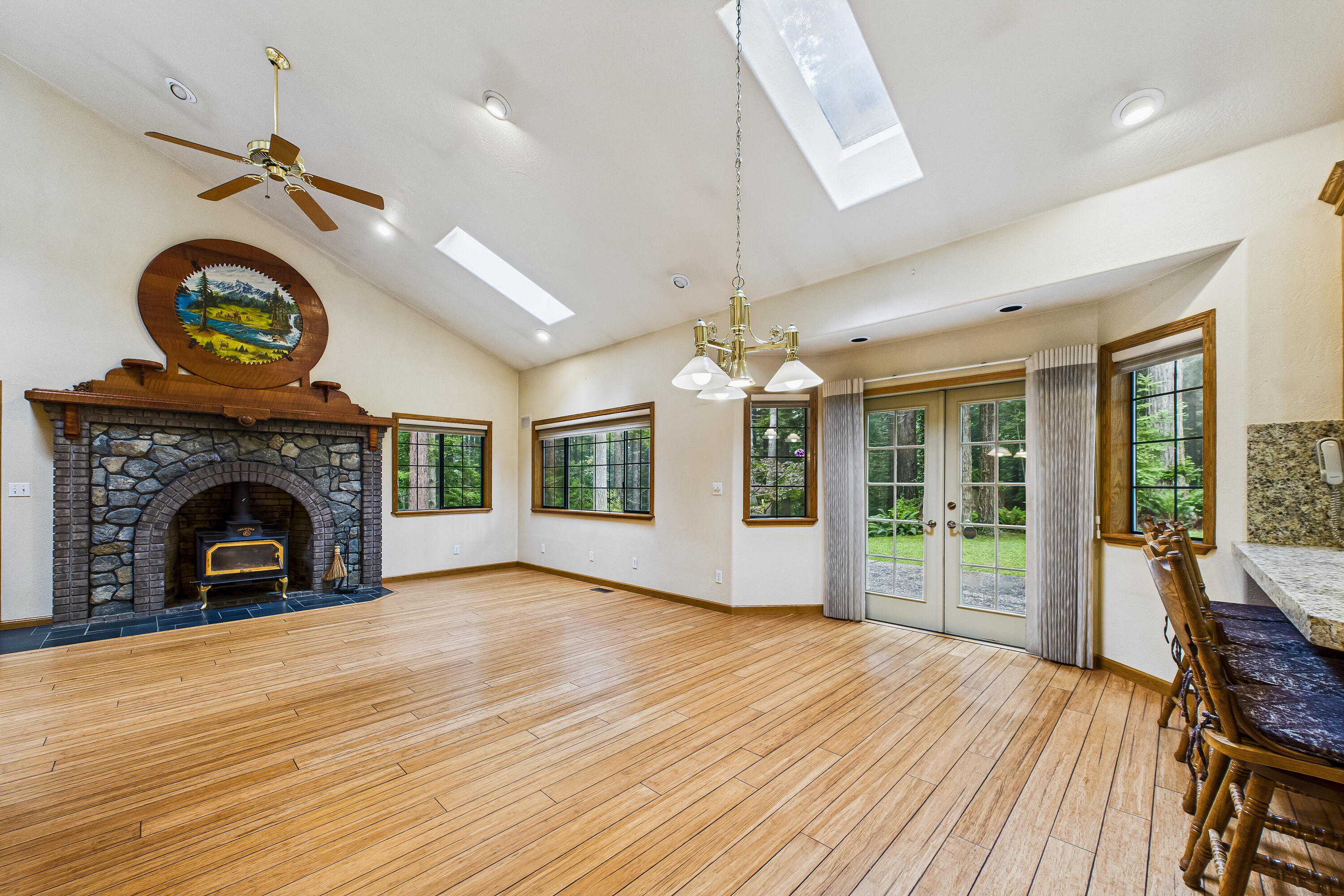Nestled on 5 serene, wooded acres, this custom-built contractor's home offers the perfect blend of rustic elegance & modern comfort. Surrounded by towering redwoods, the property creates an enchanting sense of privacy & peace—your very own lodge in the woods. Step inside to soaring vaulted ceilings, skylights that bathe the great room in natural light, & a stunning floor-to-ceiling brick & stone fireplace that anchors the living space with warmth & character. Thoughtful touches of natural wood, tile, stone, & marble are woven throughout the home, adding timeless beauty & craftsmanship. Complete with a gourmet kitchen, a chef's dream, gas range, marble countertops, custom oak cabinets & additional skylights. Entertaining a crowd or enjoying a quiet meal in, this home has IT.