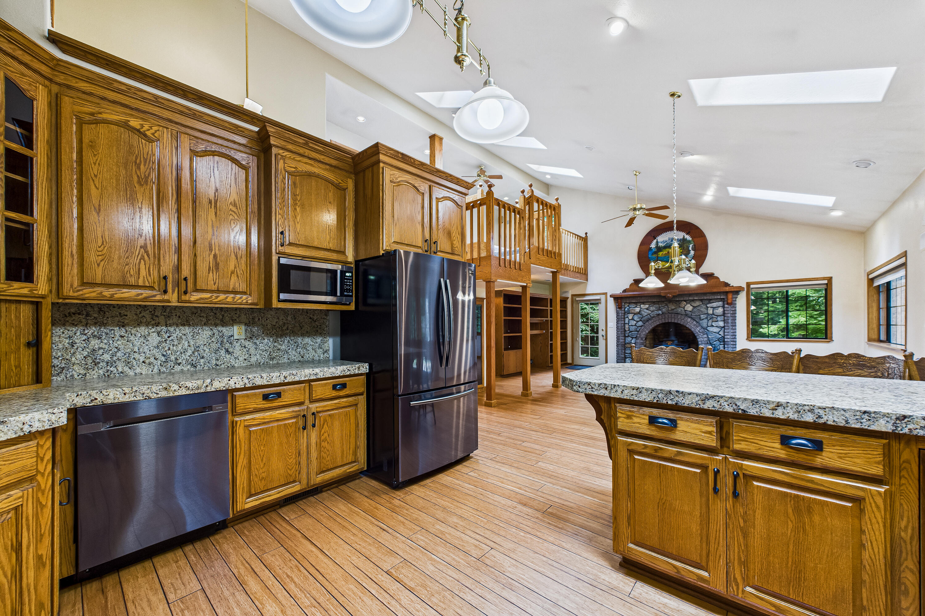 Custom-built contractor home blending rustic elegance with modern comfort, surrounded by towering redwoods for exceptional privacy and a true lodge-in-the-woods feel. The great room features soaring vaulted ceilings, skylights, and a dramatic floor-to-ceiling brick and stone fireplace. Natural wood, tile, stone, and marble accents add warmth and timeless craftsmanship throughout. The gourmet kitchen offers a gas range, marble countertops, custom oak cabinetry, and skylights. The spacious primary suite includes vaulted ceilings, private entrance and deck, walk-in closet, seating area, and a soaking tub with forest views. An open upstairs landing overlooks the main living space, while every room captures beautiful woodland views, creating a peaceful retreat.Motivated Seller! The spacious master suite is a true sanctuary, featuring its own private entrance and deck, vaulted ceilings, a cozy seating area, a generous walk-in closet, and a luxurious soaking tub that looks out onto the forest beyond. Every room in the house offers a unique view of the surrounding woodland, making nature a part of everyday life. An open upstairs landing overlooks the heart of the home