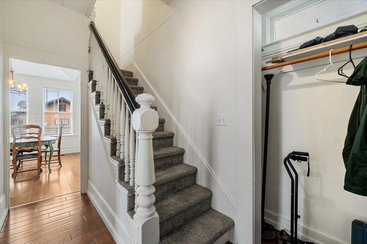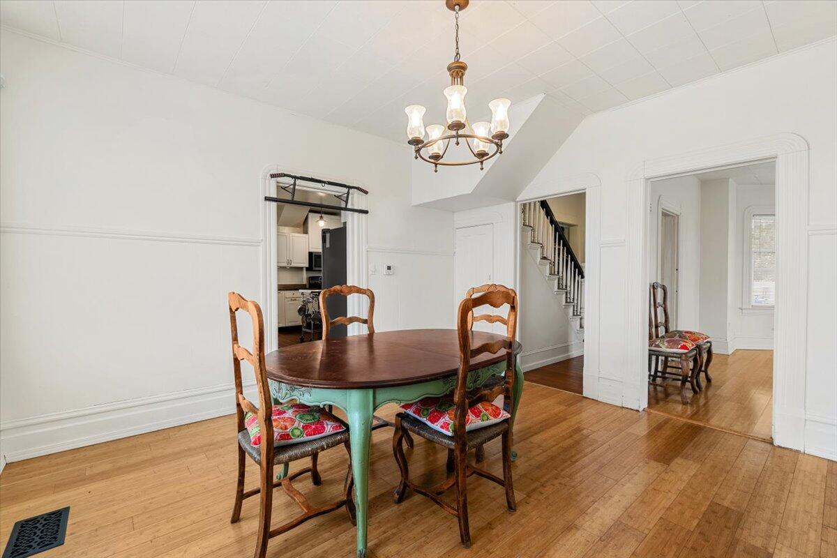 Victorian farmhouse on a spacious in‑town lot! This charming home offers 4 bedrooms plus office/den (or 5th bedroom), providing flexible living options. The large kitchen features a farmhouse sink, sideboard cabinetry, and appliances that stay. A formal dining room is perfect for entertaining, while the living and dining areas showcase newer bamboo flooring. Upstairs bedrooms have fresh carpet for comfort. All rooms are generously sized, blending classic character with modern updates. The yard is ideal for gardening, outdoor gatherings, or even adding a second unit for extra income. A 10x12 storage shed completes the property. Timeless style, versatile space, and endless potential await!