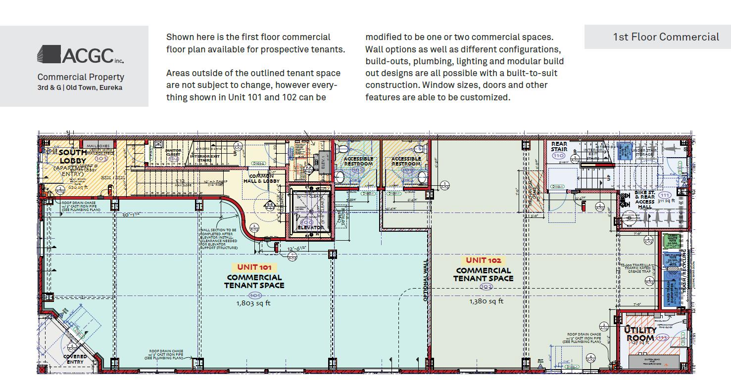 1,380- 3,183 SF. Get in on the ground floor (literally) while the construction is just beginning. 1-2 commercial spaces are available for tenants. Retail, professional offices, medical offices. But bring all your ideas and we'll see what the City of Eureka will allow. This is a mixed-use building in Old Town, with three additional floors of residential apartments above, for a built in clientele. 10-year lease minimum. The space will be delivered as an vanilla shell. No parking is available on-site.