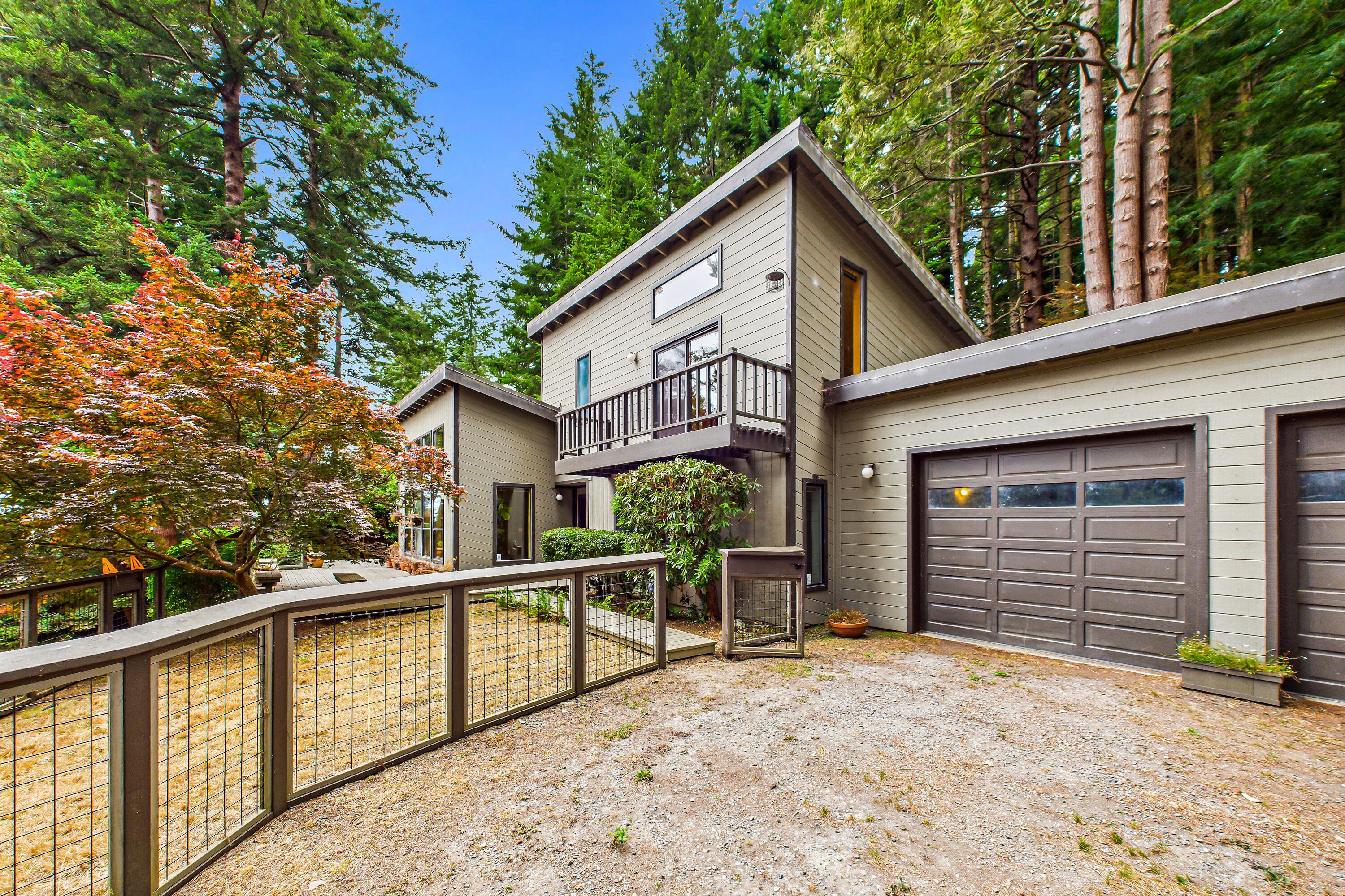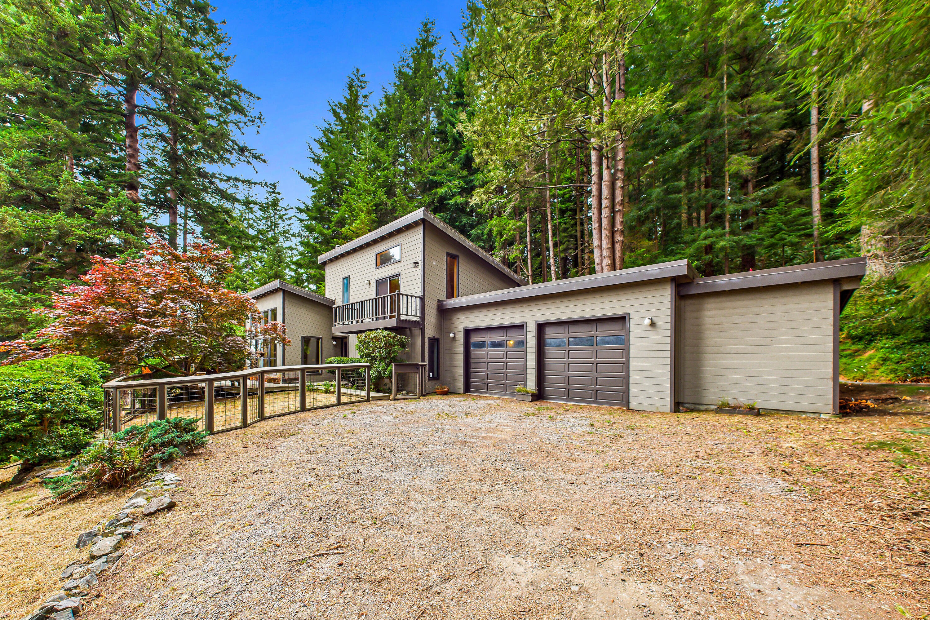 Nestled on over an acres on Buttermilk lane, walking distance to the Baywood Golf course, this contemporary 3 bedroom 2 bath home is light filled with its' vaulted architecture and wall of windows. This stylish home features wood floors, granite counters, wood stove, private primary en suite. The south facing deck creates an intimate outdoor space and a hot tub is tucked into a private corner. This home is surrounded by beautiful nature and although it is situated in town, its feels like you are in your own private park. Truly a magical environment!