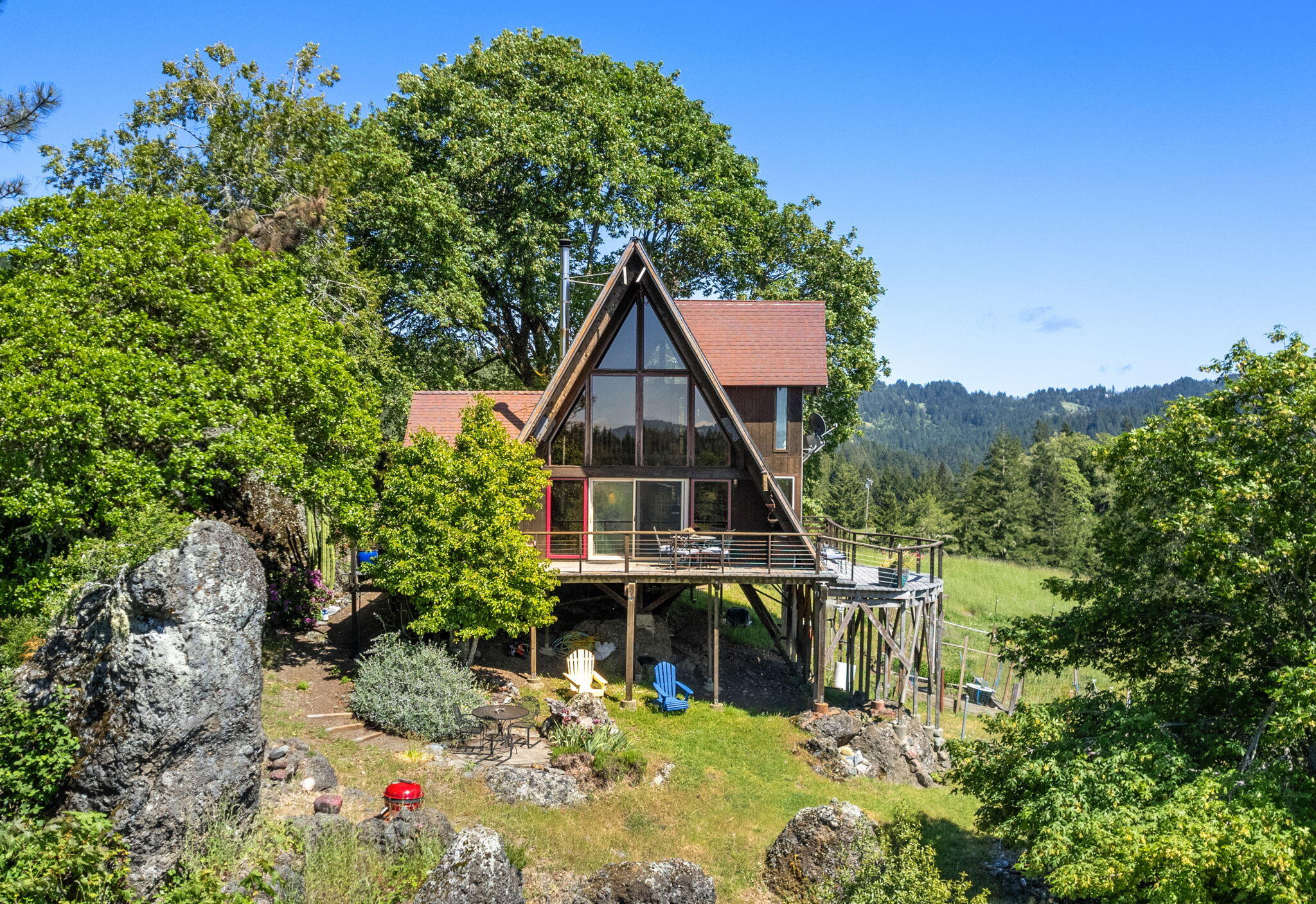 Views, views, views! This A-frame home rests perfectly on its 20 acres for optimal views from all directions. As you walk to the front door, you are surrounded by unique rock formations on both sides. The wrap around deck gives you plenty of area to read your favorite book and/or enjoy those sunny days. Being an A-Frame home makes many unique spaces where every nook inside the house has been thoughtfully designed for sleeping and fun play spaces for the family. Creek on the property as well as a spring fed water system, septic tank and propane for gas. This is a very fun and unique property that you won't find again on the market. Call for a private showing!