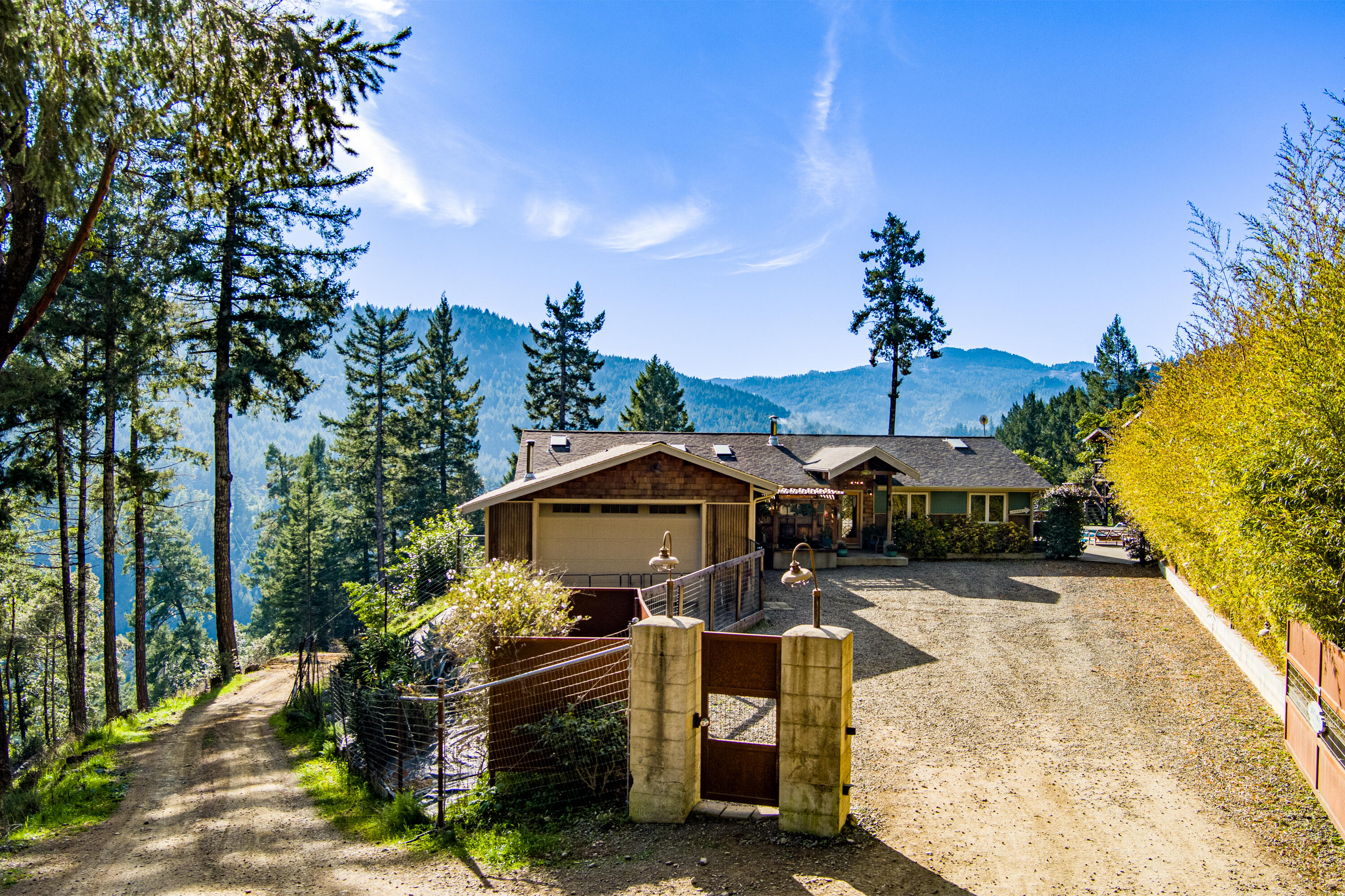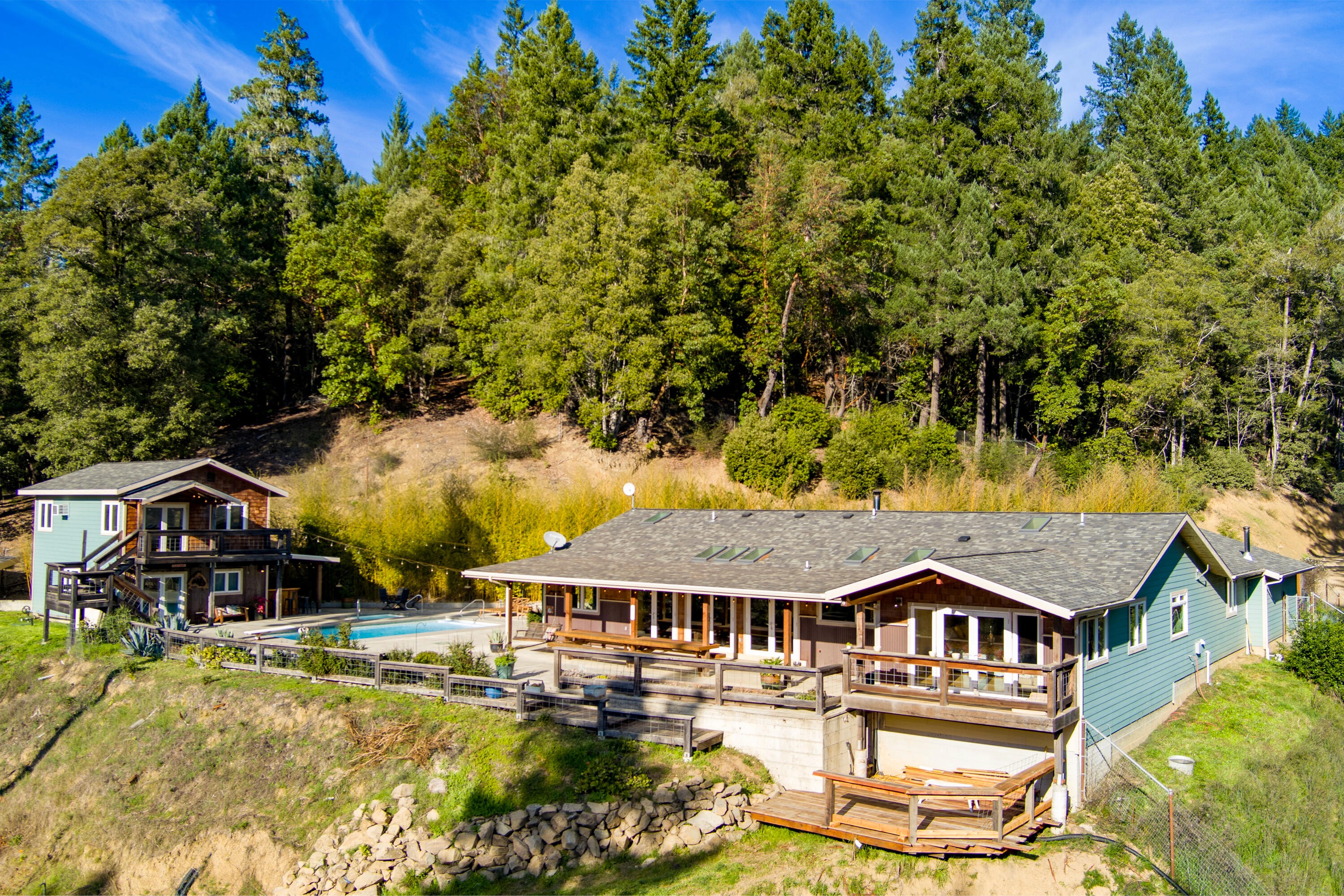A private Salmon Creek compound on 39 acres, surrounded by forest and mountain views, with PG&E power, multiple living spaces, and just 10 minutes to town. This is the kind of property people relocate to Humboldt for. Set near the iconic Avenue of the Giants, the land offers a peaceful mix of forest and open space, creating a setting that feels private, grounded, and connected to nature without feeling remote. Life here unfolds naturally indoors and out. Imagine preparing meals in the custom kitchen while taking in the surrounding views, opening the doors to share meals outside, and spending warm afternoons by the pool with family and friends. The layout encourages an easy flow between interior living spaces and outdoor gathering areas, making everyday moments feel intentional and unhurried. Beyond the main living spaces, the land itself invites a more self-sufficient lifestyle. With ample acreage and room to roam, the property is well suited for animals, gardens, and homesteading at its finest, whether that means keeping livestock, tending gardens, or simply enjoying the freedom of open land and rural living. Designed as a flexible residential compound, the property offers multiple living areas that allow for both togetherness and privacy, making it well suited for multigenerational living, extended family stays, or separate work-from-home and guest spaces. A true standout feature is PG&E power, paired with excellent accessibility, located just one mile up a dirt road with quick access to Highway 101, offering the rare balance of rural privacy without a long or difficult drive. While the setting feels like a retreat, daily conveniences remain close at hand. Private, usable, and thoughtfully developed, this Salmon Creek property offers more than a place to live, it offers room to slow down, spread out, and build a long-term life connected to land, nature, and community in one of Southern Humboldt's most special areas. For buyer convenience, a recent home and pest inspection and appraisal have been completed and are available for review.