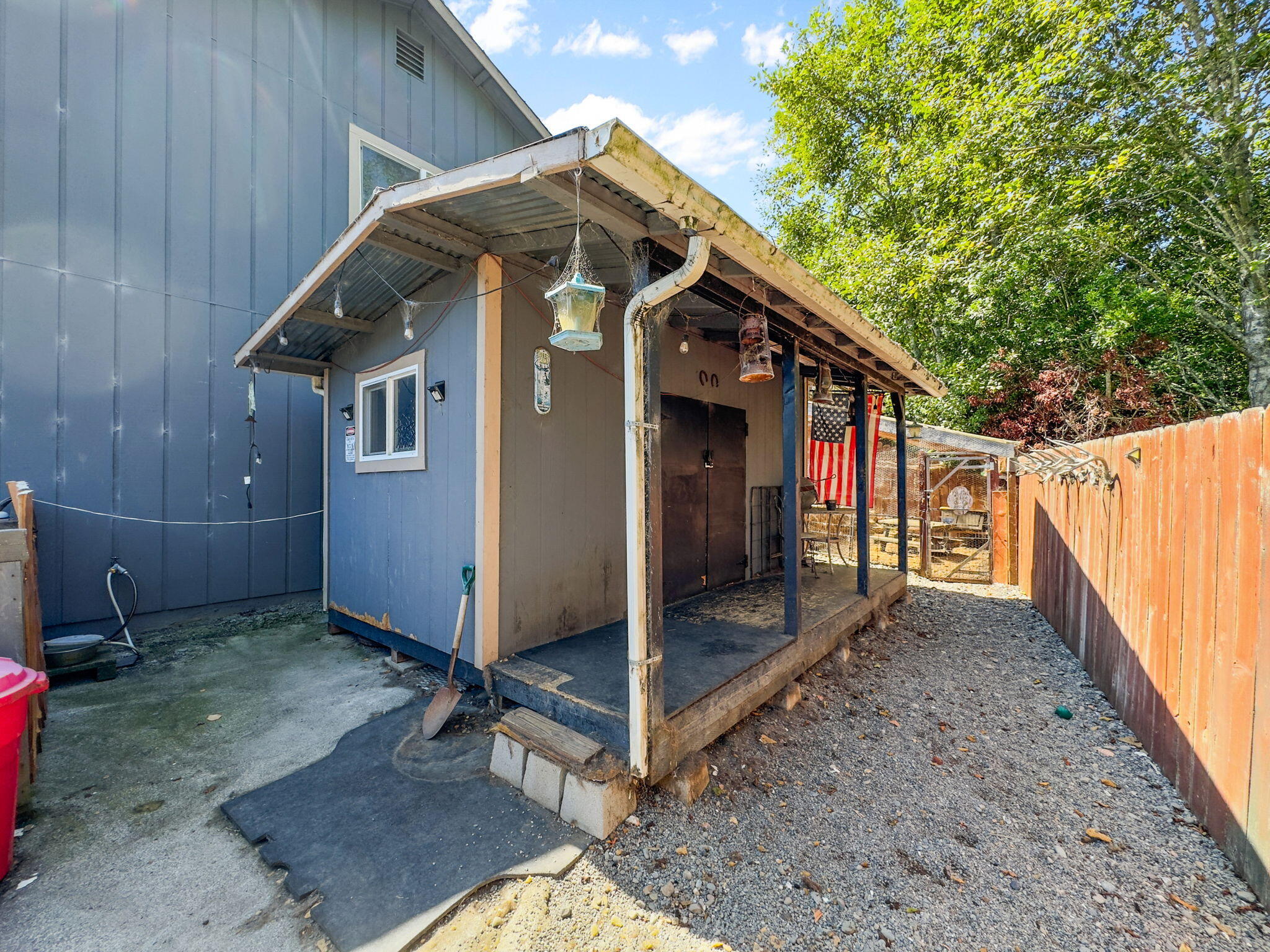 Entrance to back yard through exterior fence gate OR through door at far side of garage. Many possibilities with utility shed and yard space for your imagination !