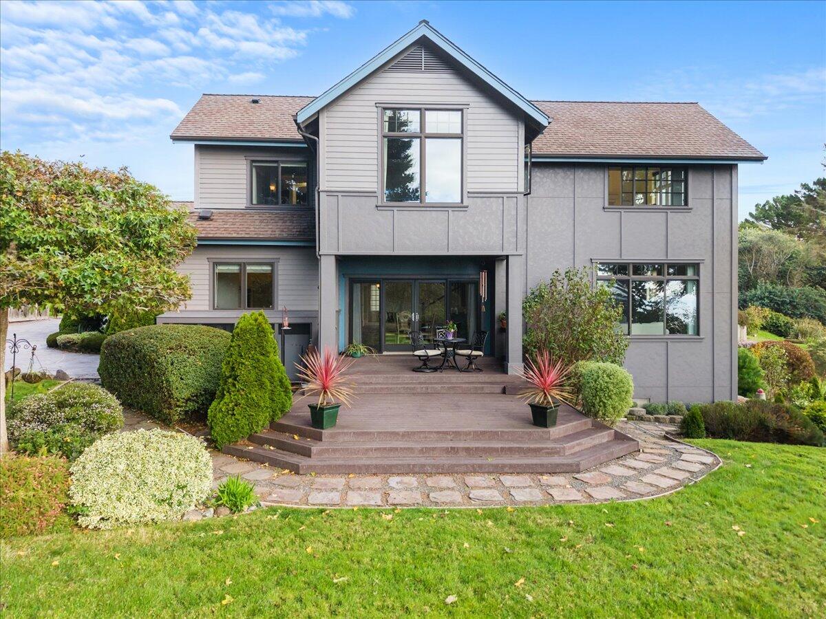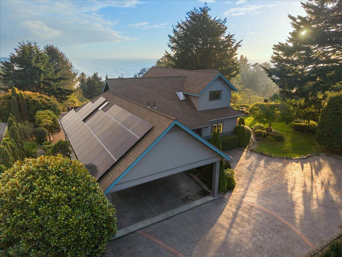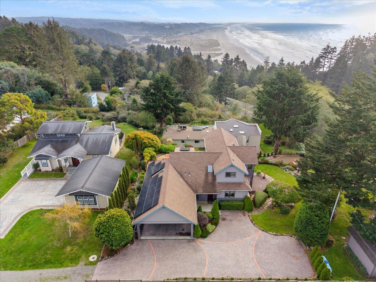 No detail was spared in the design and construction of this custom coastal retreat. Nestled above the shoreline with sweeping sightlines stretching from Clam Beach to the open Pacific, the home is oriented to capture the ever-changing beauty of the coastline from nearly every room. The layout is ideal for gatherings, offering multiple spaces for guests to unwind. The open kitchen and spacious dining area flow seamlessly to a west-facing deck through expansive sliding glass doors. The living room, anchored by a warm fireplace, opens to a generous south-facing deck—perfect for sunset lounging. And the hot tub? Its outlook over the ocean is pure chef's kiss. Upstairs, every room embraces the coastal panorama. The large office showcases an extraordinary perspective of Clam Beach— one rarely seen in a Trinidad or Westhaven residence. This level also features two bedrooms, a well-appointed bathroom with a deep soaking tub and a separate tiled shower, built-in bookcases, and a beautifully finished walk-in attic. Downstairs offers another office, a third bedroom, and an additional bathroom. Designed by acclaimed architect Kash Boodjeh of K. Boodjeh Architects, this 3,170 sq ft home blends natural textures, modern comforts, and a serene beachside sensibility, creating a living experience that feels both refined and deeply rooted in its environment. Solar panels, backup battery systems, and hard-wired internet in seven rooms support a smooth, sustainable, and highly functional lifestyle. Outdoor living unfolds effortlessly with decks overlooking lush , professionally landscaped gardens bursting with color and textureinviting you to linger, explore, or simply enjoy the coastal breeze. A built-in fire pit sets the tone for evenings beneath the salt-tinged sky, while two covered parking spaces and additional guest parking add everyday convenience. A rare offering in one of the North Coast's most cherished settings, this distinctive home embodies architectural elegance paired with the relaxed, natural beauty of coastal living.