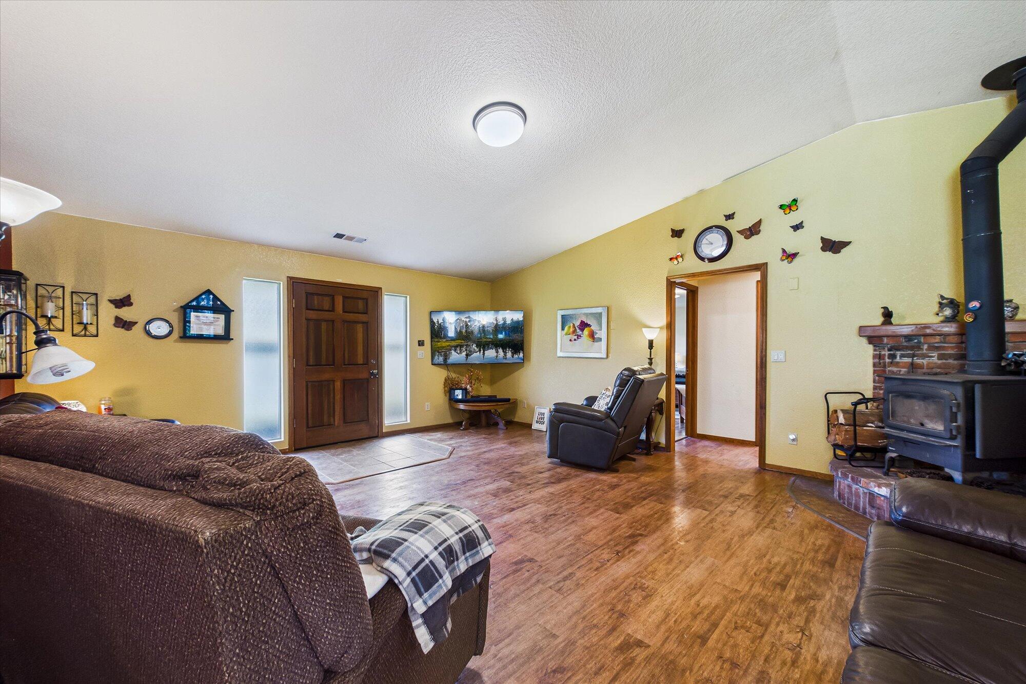 Welcome to 4677 Mitchell Road~! This 3 bedroom 2 bath home sits on 6 acres with a detached garage/shop with a MIL unit above. Enjoy a very open chefs kitchen with granite countertops and lots of natural light, a large open dining area, family/living room with a freestanding fire place, expansive deck with a hot tub, an additional space currently used as an office which could be converted into a fourth bedroom, inside laundry room, large attached 2 garage as well as outdoor space that allows for animals to be kept separate from communal spaces and several sheds for storage. The detached shop offers 220 power, has its own bathroom and plenty of space for projects or just extra parking. Located above is a studio MIL with a separate entrance and addition RV parking pad outside.