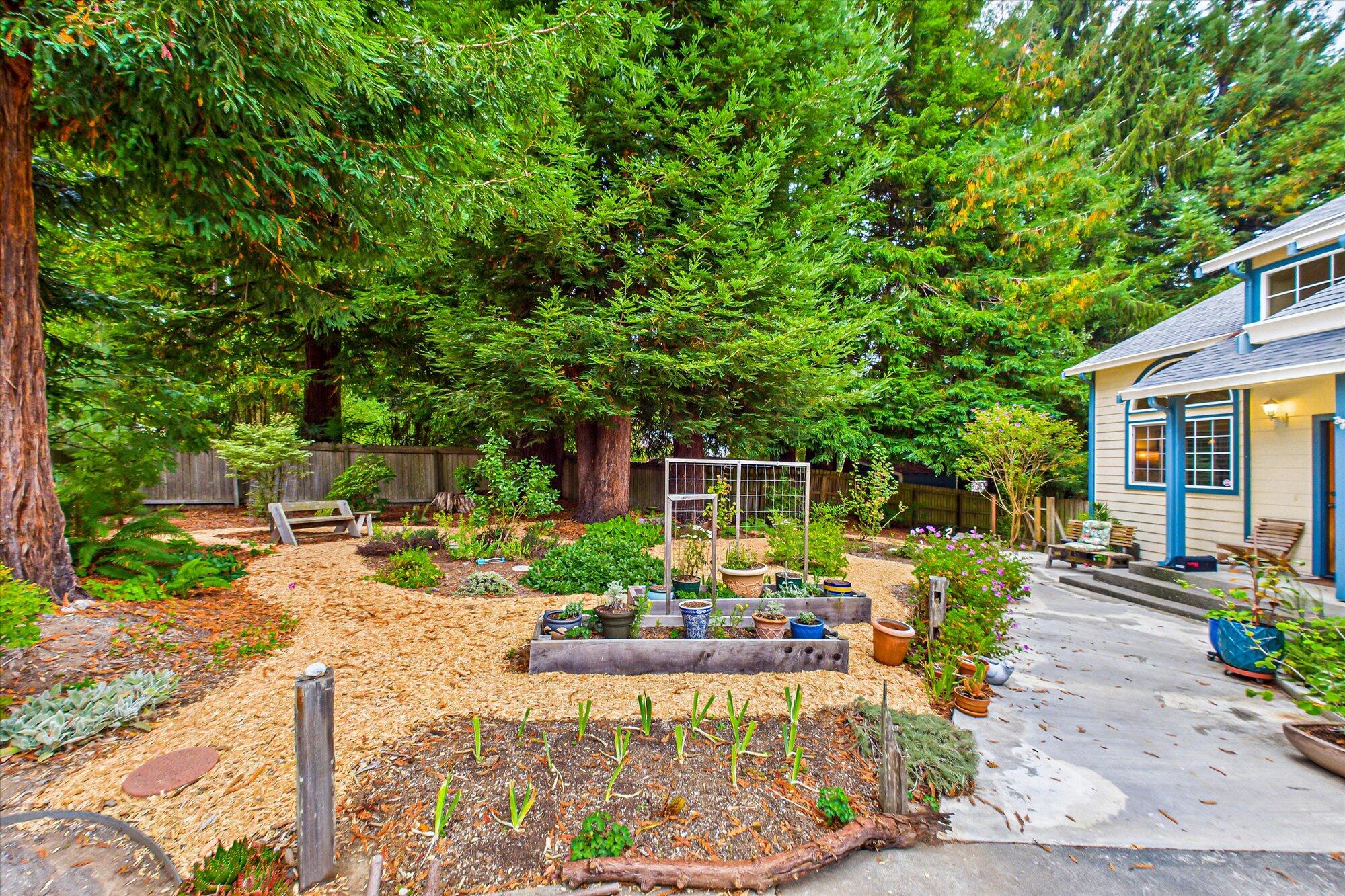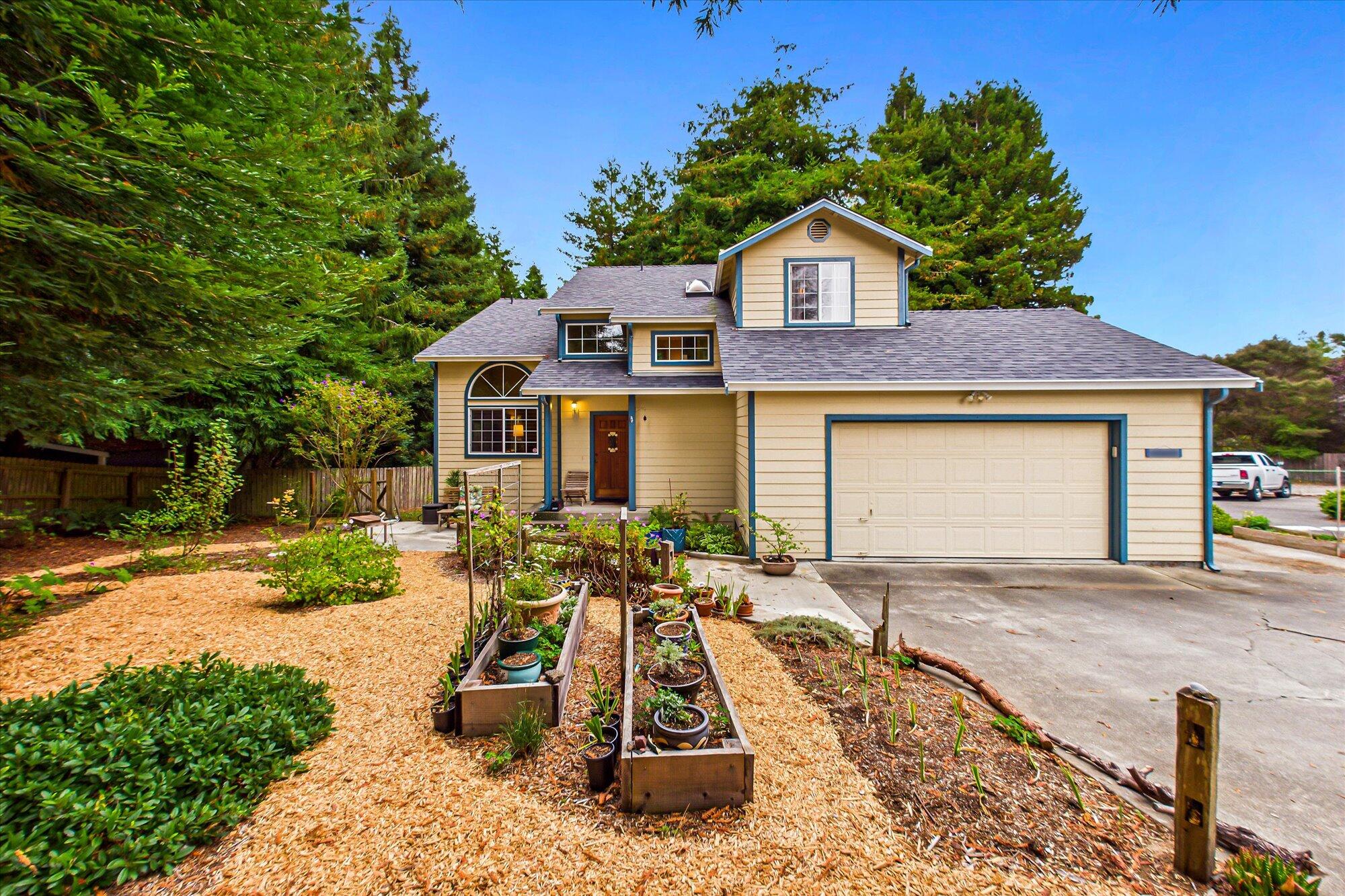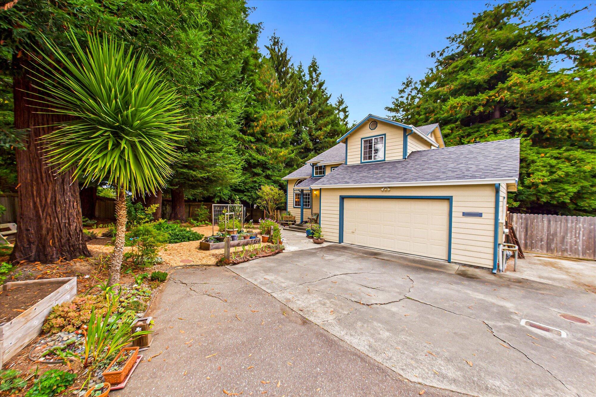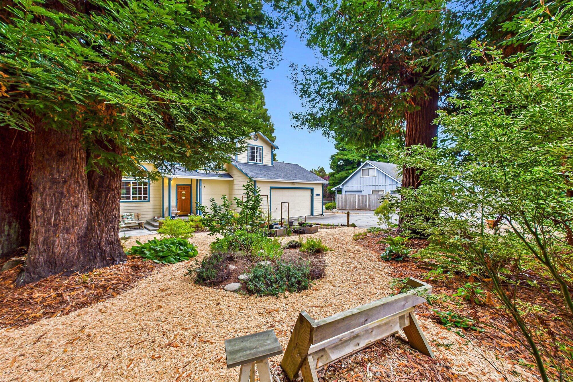 Discover this stunning custom 2-story home with 3 bedrooms & 2.5 baths, offering approx 1,470 sq ft of thoughtfully designed living space. Step into the living room featuring cathedral ceilings, a wall of windows, & breathtaking wooded views with towering redwoods. French doors lead to a generous deck, perfect for relaxing or entertaining amid nature. The remodeled kitchen boasts granite counters & stainless steel appliances, while the primary suite impresses with a soaking tub, separate stall shower, & a private balcony. Enjoy gardening on the spacious .33-acre lot. Additional highlights include a double garage, a separate laundry room, & a tranquil setting down a private lane. This exceptional property blends comfort and style in a serene natural environment—your ideal retreat awaits!