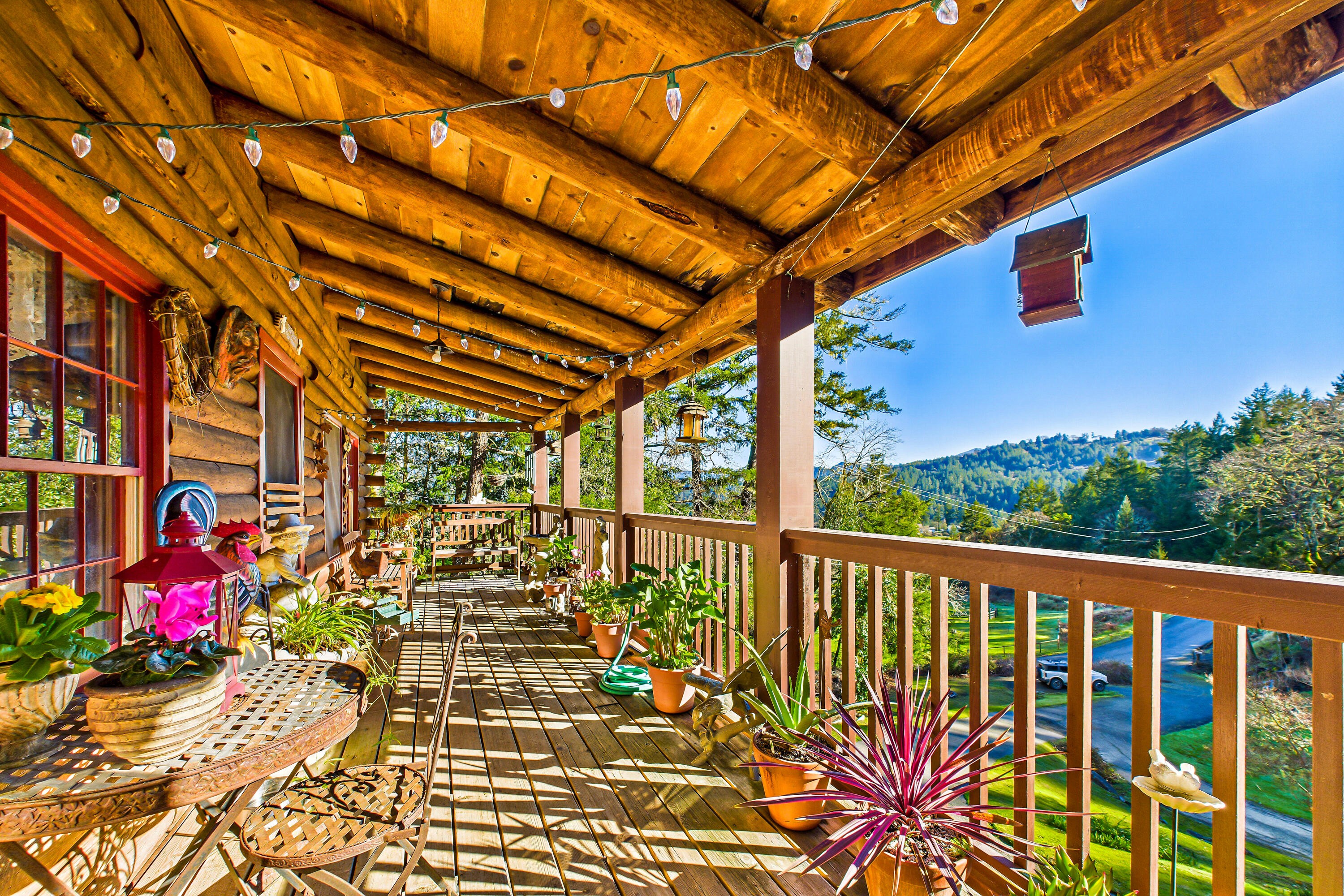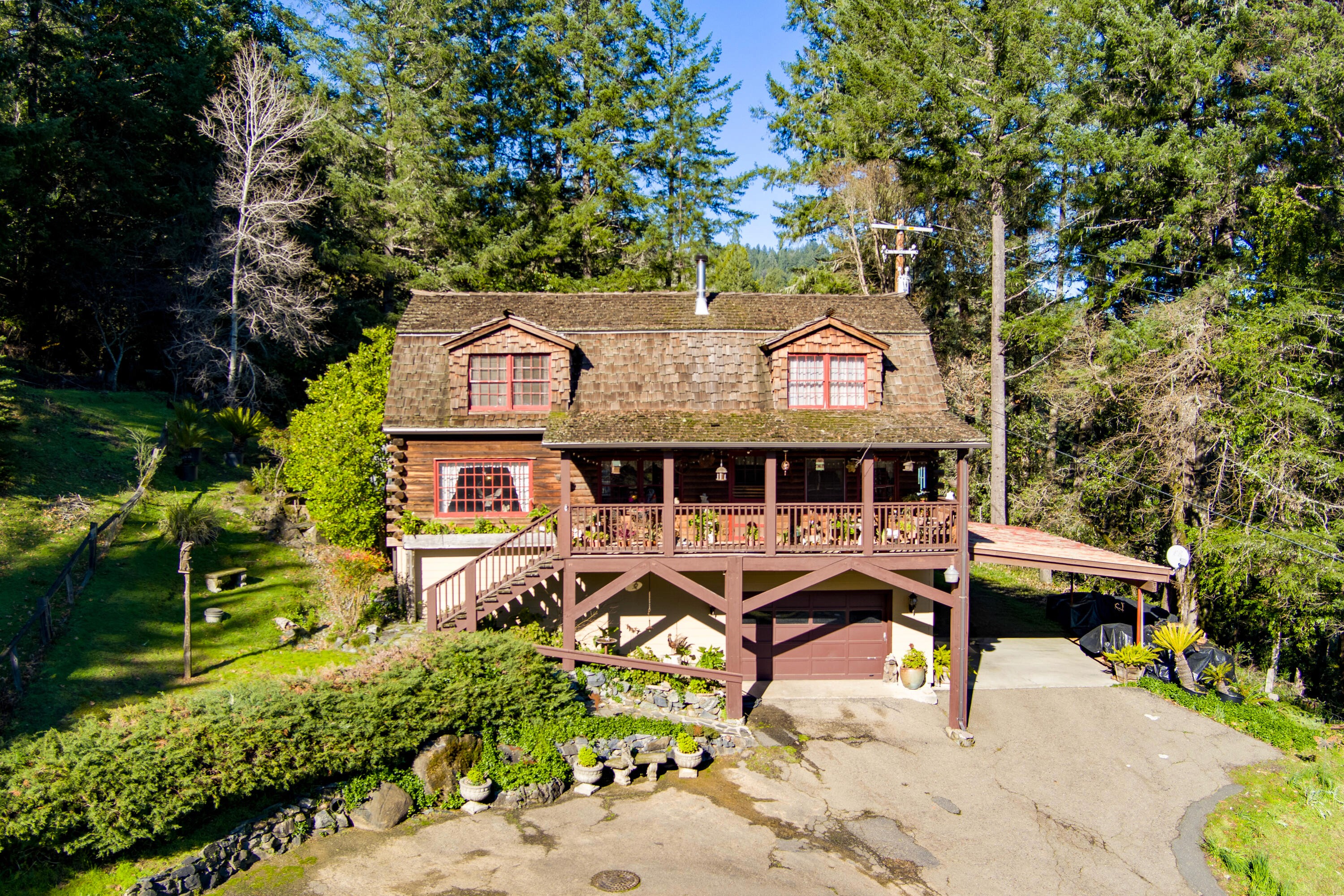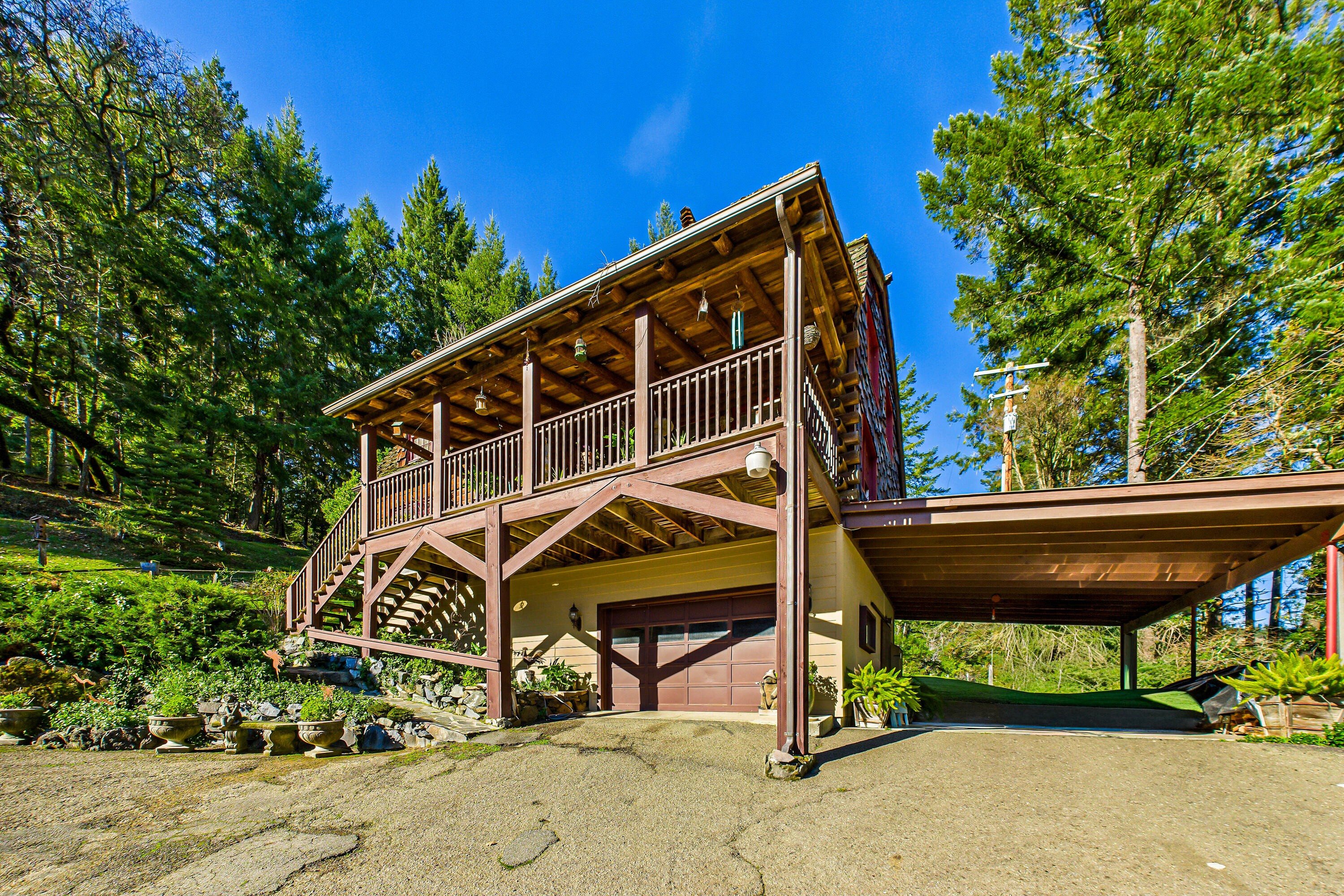 Located just five minutes outside of Garberville along a county-maintained stretch of Old Briceland Road, this exceptional horse property offers a rare balance of convenience, privacy, and functionality, anchored by a true log cabin home with timeless character. The property is also just minutes from the Eel River adding to the area's outdoor and recreational appeal. The main residence is a classic log cabin, rich with exposed logs, wood beams, and a warm lodge-style feel throughout. Natural light fills the living spaces, and the layout flows comfortably for everyday living and gatherings. Covered decks and porches extend the living space outdoors, creating inviting areas to relax and enjoy the surrounding landscape in every season. In addition to the main home, the property includes a barn with a separate living space above, ideal for guests, extended living, or flexible use. Above the homesite, a flat, usable area with its own power and water offers excellent space for a trailer, RV, or future use, and enjoys open views looking out toward Garberville, a rare and valuable perspective that adds both beauty and versatility to the property. Below the homes, the land opens into a truly turn-key equestrian setting. Designed with both horse and owner in mind, the property features enclosed horse stalls, a tack room, fenced and cross-fenced pasture, and a spacious round pen set on gentle, usable ground. The layout supports easy daily care, safe turnout, and practical horse use. With PG&E power, reliable water, and county road access, the property offers peace of mind alongside its pastoral setting. Thoughtfully laid out and hard to replicate, 501 Old Briceland Road is a rare opportunity to own a true log cabin horse property with views, infrastructure, and town just minutes away.