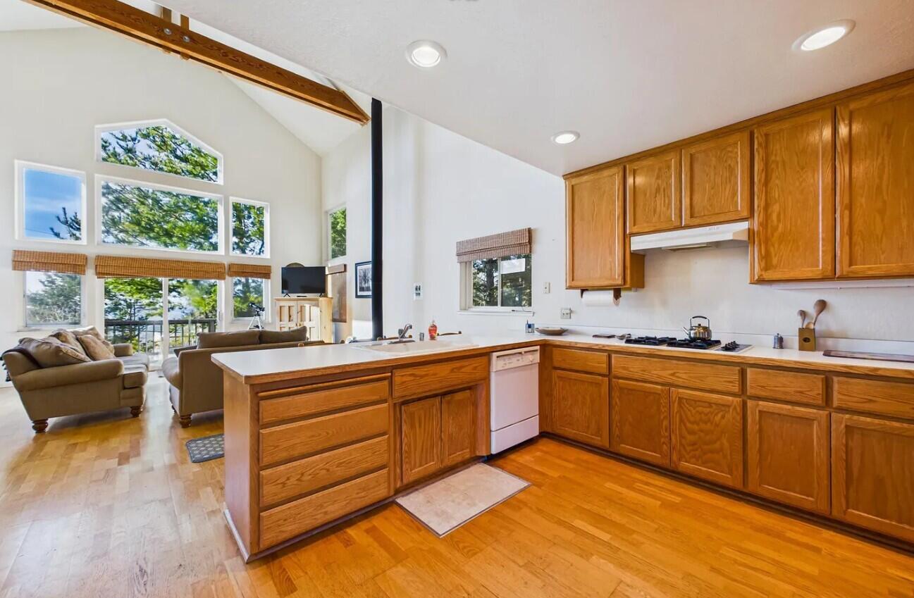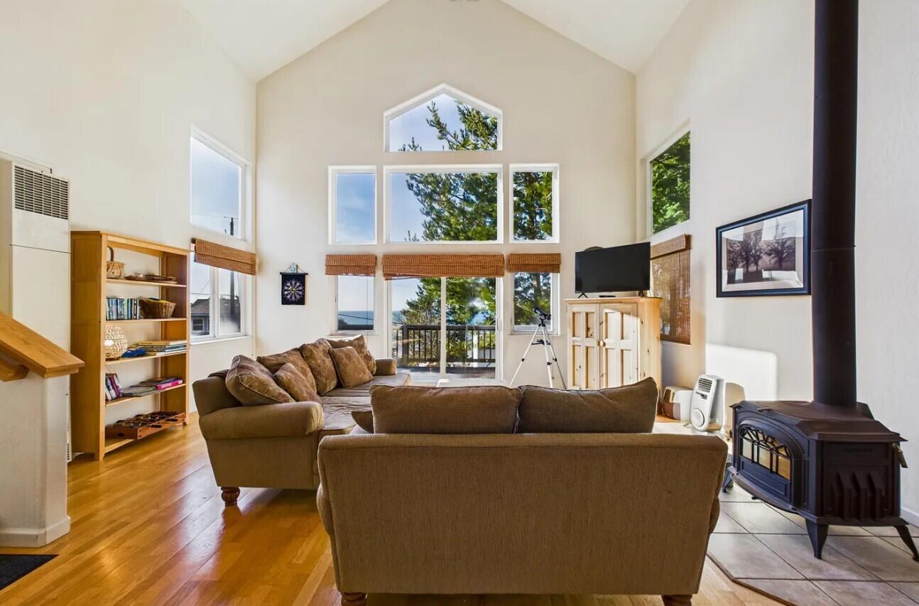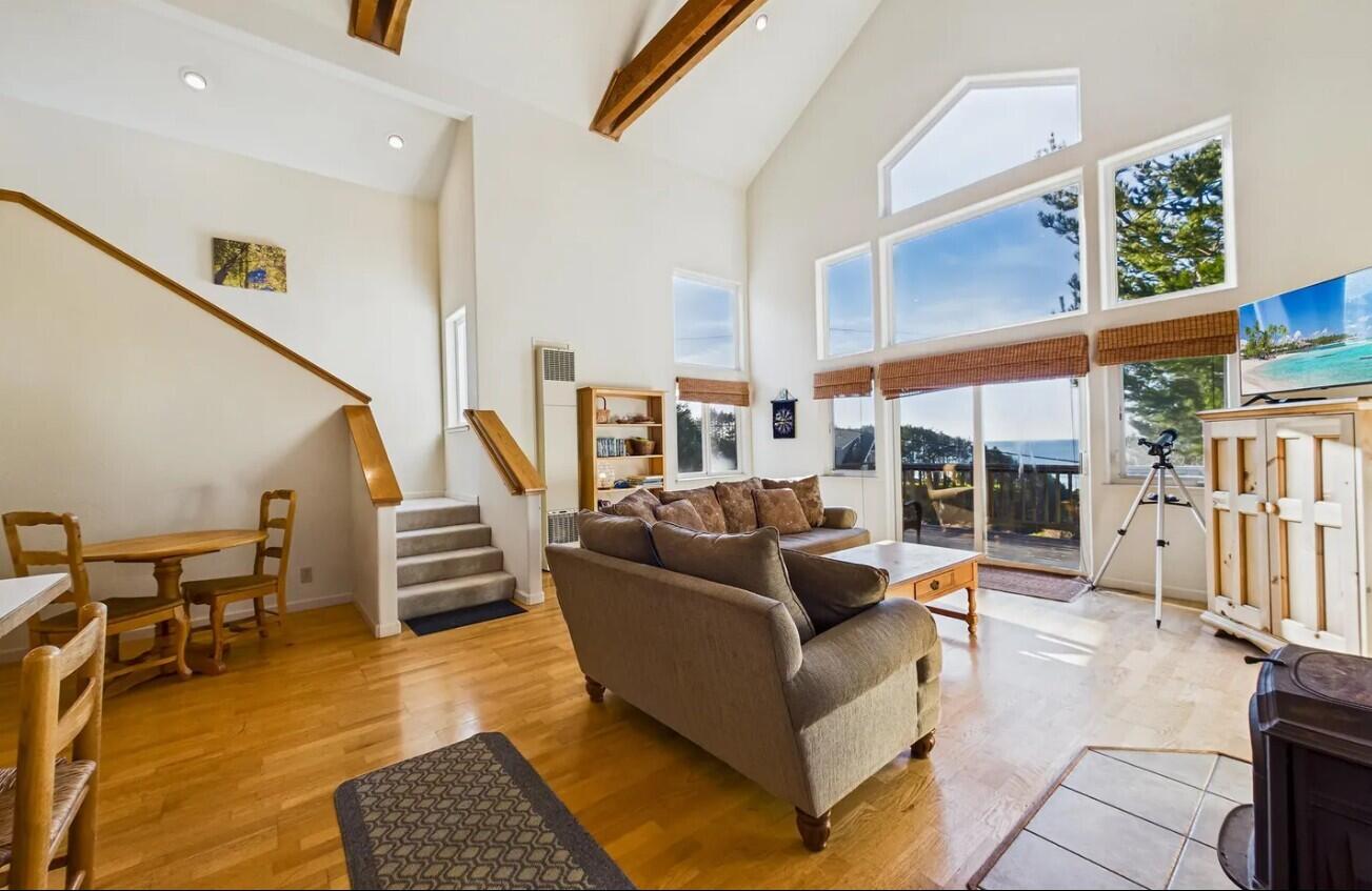 Soak in panoramic ocean scenery and the rhythmic sound of surf from this inviting 2 bed 2 bath coastal Vacation Rental near Black Sands Beach. A bright, 1450 sf open-concept design highlights the main level, featuring a generous living area, airy kitchen, and a private bedroom with a full en-suite bath. The upper level offers a versatile loft-style bedroom and an additional full bath, ideal for guests. Step onto the spacious deck to relax, entertain, and enjoy colorful sunsets after a day outdoors. A one-car garage provides secure storage, while the nearby carport offers covered parking. Located within minutes of Black Sands Beach and the trailhead of the renowned Lost Coast Hiking Trail, this home blends comfort, convenience, and coastal adventure.