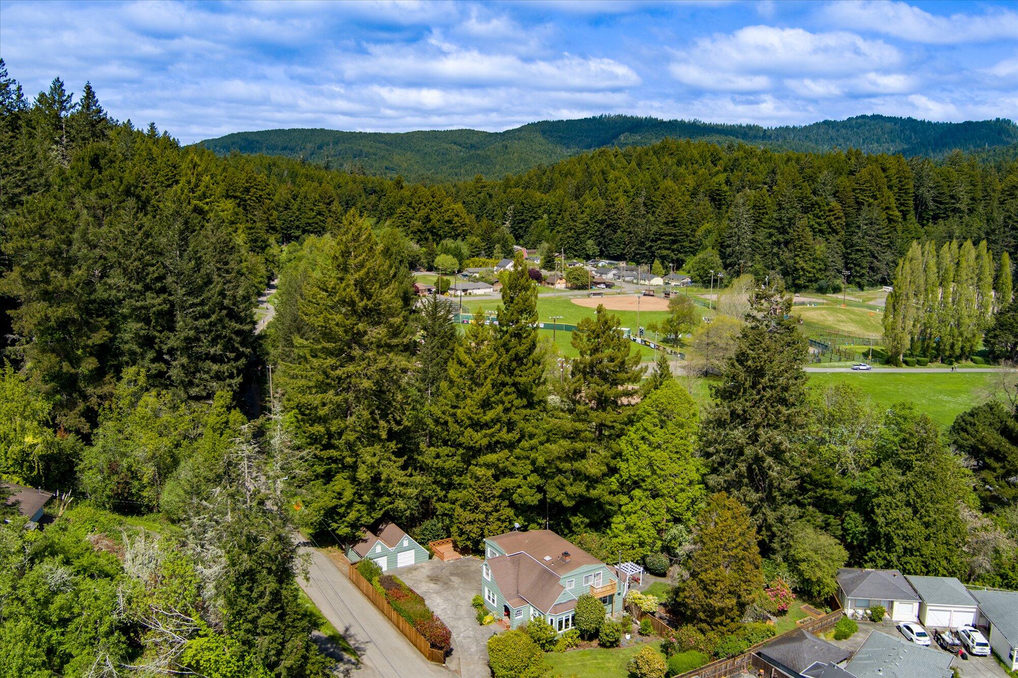 A Fortuna Classic -- Timeless Charm, Private Garden Sanctuary, and Redwood Canopy Living Step into one of Fortuna's most distinctive homes -- a beautifully maintained Dutch Colonial that commands attention from the moment you arrive. Framed by towering redwoods and firs, the sage-green shingle exterior, arched entry, and matching 2-car detached garage set an unmistakable tone: this is a home with character, craftsmanship, and soul. Inside, nearly 2,000± square feet of living space flows across two thoughtfully designed floors. Original hardwood floors gleam throughout the main level, complemented by crown molding, plantation shutters, and generous ceiling heights that give every room a classic, elevated feel. The formal living room -- anchored by a brick fireplace and a sweeping multi-pan bay window -- fills with natural light and garden views year-round. A second family room provides flexible space for a media room, playroom, or home office, while the formal dining room easily accommodates gatherings of any size. The main-floor primary suite offers single-level convenience, while three additional bedrooms upstairs -- including one nearly 20 feet long -- provide room to grow, host, and create. A private balcony off the upper level adds another layer of connection to the surrounding landscape. Outside, the property truly distinguishes itself. The backyard is a curated garden retreat: a manicured lawn bordered by blooming camellias, magnolias, and ornamental perennials, all enclosed by a redwood privacy fence. Follow the stone path to one of the property's most unique features -- a wooden observation deck over the seasonal creek, set beneath a cathedral canopy of mature redwoods. It's the kind of spot that stops you mid-sentence. The oversized concrete driveway accommodates multiple vehicles, trailers, and boat storage with ease, making this home equally suited for outdoor enthusiasts and large households. Located in the heart of Fortuna -- close to schools, parks, shopping, the Riverwalk trail system, and the Eel River -- this is a rare opportunity to own a home that genuinely has it all: space, style, and a setting you won't forget.