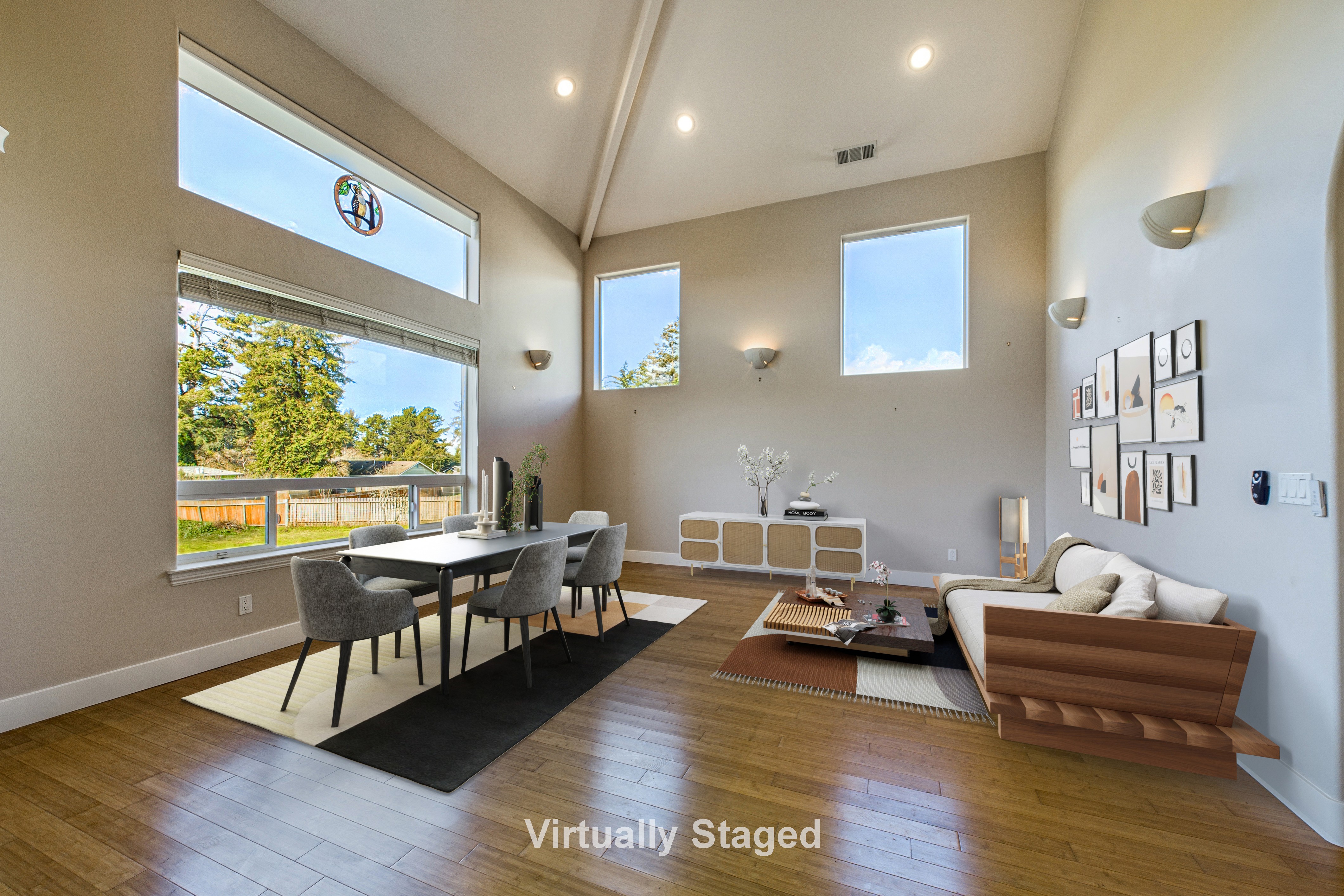 The majority of residences are single-family homes. The homes have yards and often afford sweeping views of the bay, rolling hills, or the trees that surround the area.